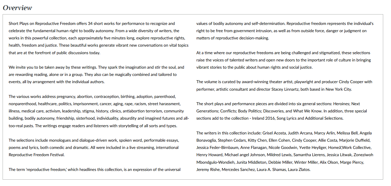 Our anthology, Short Plays on Reproductive Freedom, has 34 new short plays and performance pieces from our Reproductive Freedom Festival and more.